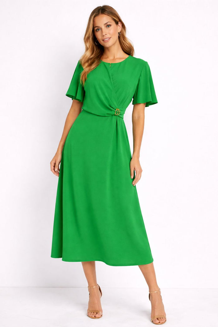Short-Sleeve Faux-Wrap Midi Dress in Green