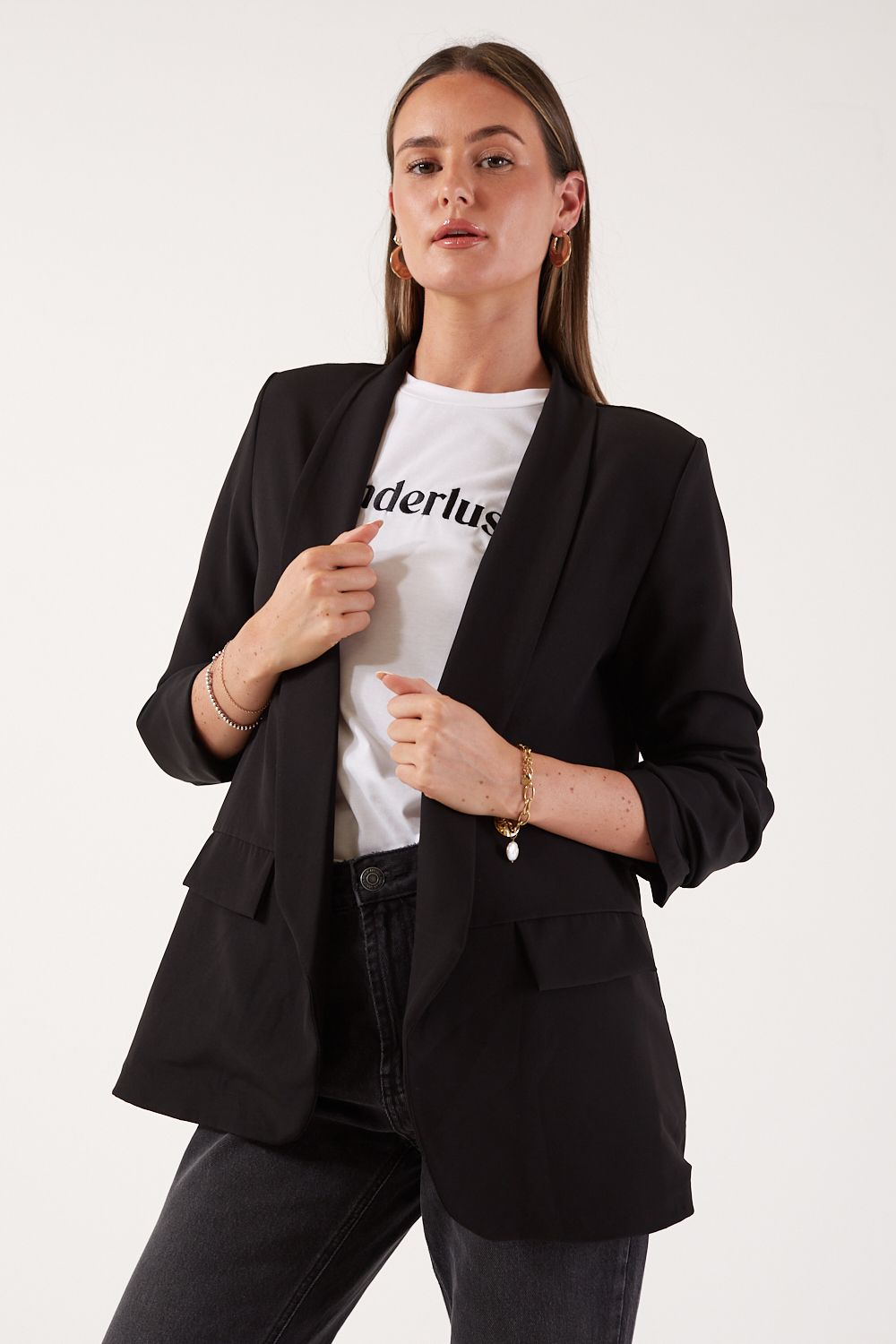 We are in love with this ruched sleeve blazer, with an open style and a soft silhouette, wear this key piece with everything from dresses to jeans depending on your occasion.