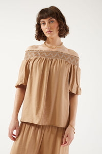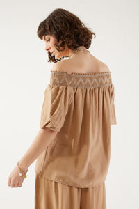 The Carmelia top features an elasticated shoulder,=, short sleeves, embroidered details at the shoulders and a lightweight fabric - a combination that guarantees comfort and style. Ideal for a casual summer look, pair it with its matching trousers and sliders for a low-key boho outfit.