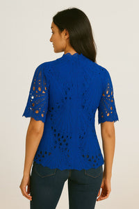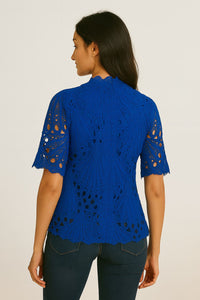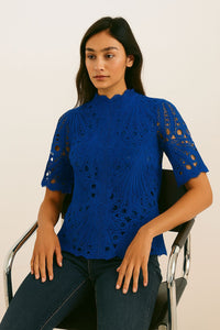 Elevate your everyday style with this striking royal blue lace blouse, designed to make a statement. Crafted from intricate lace with a scalloped hem and sleeves, this top beautifully combines elegance with modern edge. The high neckline and short sleeves add a refined touch, while the semi-sheer lace pattern brings in a playful hint of allure.