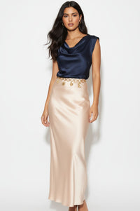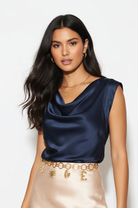 Elevate your evening wardrobe with the Lia Satin Cowl Neck Top in Navy. This stunning piece combines elegance with comfort, making it a favorite for night outs. The luxurious satin fabric drapes beautifully, adding a touch of sophistication that’s perfect for any occasion. Whether paired with tailored trousers or a sleek skirt, this top exudes effortless style. Featuring a flattering cowl neck design, the Lia top is available in sizes S, M, L, XL, and XXL to ensure a perfect fit for every body type. The rich navy color enhances its versatility, allowing for easy integration into your existing wardrobe. As part of our Dressy Tops collection, this new arrival is your go-to for creating unforgettable looks. Transform your nights with the chic allure of the Lia Satin Cowl Neck Top!