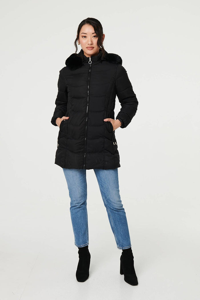 Faux Fur Hooded Zip-Up Puffer Jacket in Brown