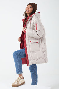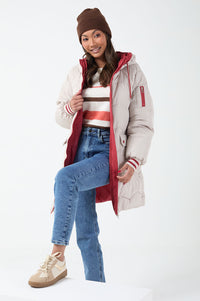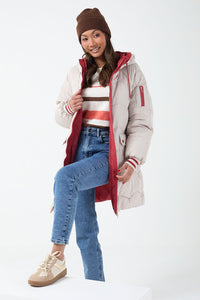 We are in love with this padded jacket new in from the Saint Maine collection. Something a little different from the usual in this fab beige and red colour way with contrast zipper lining and tie details. Twin pockets to the front