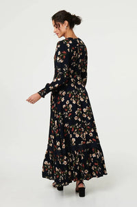 You're sure to look elegant in this beautiful maxi dress. It has long puff sleeves, a v-neck, and front buttons. The shirred waist flares into an a-line skirt that will float around your legs, whether you're dancing the night away at a wedding or dressing it down with trainers. It also has a lace trim around the hem.