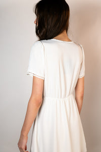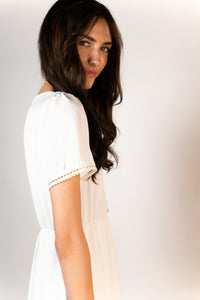 Introducing our ultimate little white dress, the ideal addition to your summer wardrobe. This versatile piece can be dressed up or down, making it perfect for any occasion. It features short sleeves with beautiful detailing and an elasticated waist for both comfort and a flattering shape. Lightly lined for added comfort, this dress effortlessly combines style and ease.