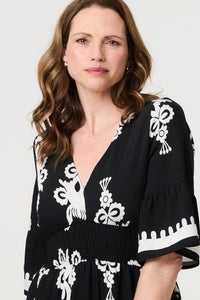 Ikat Print 1/2 Sleeve Relaxed Short Dress in black