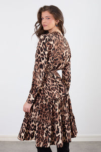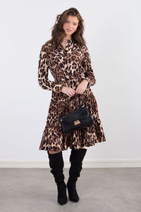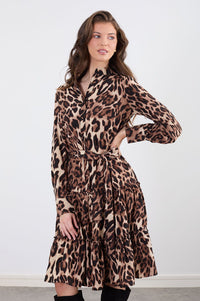 Crafted from lightweight fabric, the dress features long sleeves and a smock style that flatters all figures. Available in sizes 8 to 16 and a rich brown hue, this eye-catching piece is designed to turn heads. The combination of a modern shirt dress silhouette with timeless animal print makes the Steffi a must-have addition to your wardrobe. Embrace your wild side while staying stylish!
