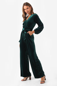 Vivian V-Neck Velvet Long Sleeve Jumpsuit in Green