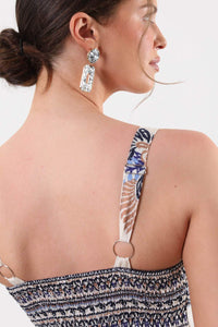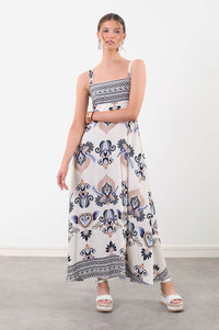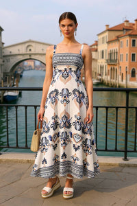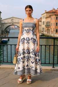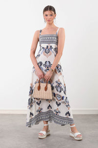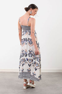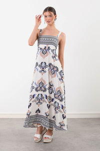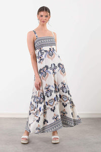 Enchanting Paisley Maxi Dress in Off-White. This stunning maxi dress boasts a captivating paisley print in shades of navy, beige, and light blue. Exquisite embroidery details along the neckline and hem add a touch of elegance. The flowing A-line silhouette and comfortable linen fabric make it perfect for making a statement this season.
