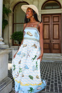 Step into seaside charm with this breezy midi dress adorned in a vibrant ocean-inspired print. Featuring delicate spaghetti straps, a flattering straight neckline, and a relaxed flowing silhouette, it’s perfect for warm-weather adventures. The dress showcases detailed seashells, sea creatures, and soft wave patterns in cool blue tones, finished with a decorative border trim. Ideal for beach getaways, summer strolls or casual daywear, this dress combines comfort with statement style.