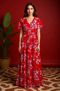 Step into effortless elegance with this ankle-length maxi dress, designed for a perfect blend of comfort and style. Featuring a vibrant red base adorned with an eye-catching floral print in shades of pink, blue, and white, this dress brings a lively pop of color to your wardrobe.