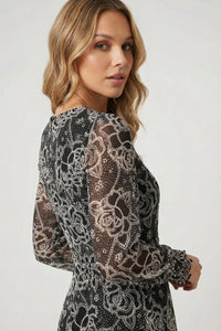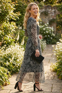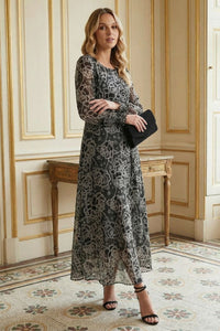 Maxi dress constructed with a sheer overlay featuring a black and white intricate floral and geometric print, and an opaque black lining. It features a round neckline and long sleeves with gathered, elasticated cuffs. The waist is defined by a self-fabric tie belt. The skirt is designed with a flowing, A-line silhouette.Material: 100% Polyester.\nCare: Cold Hand Wash