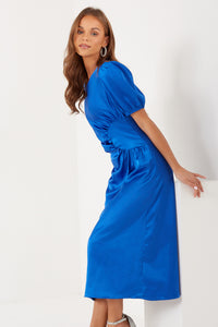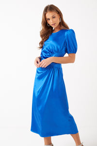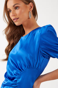 Annalise Puff Sleeve Satin Midi Dress in Blue