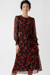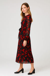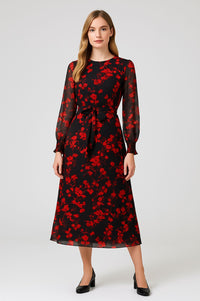 Turn heads in this elegant Black & Red Floral Midi Dress, a statement piece perfect for both day-to-night styling. Crafted in a flowing lightweight fabric, this dress features a flattering fit-and-flare silhouette with a self-tie waist belt for a defined shape. The bold red floral print pops against the deep black base, while the sheer long sleeves add a touch of sophistication and ease. Finished with a round neckline and midi length, this dress is timeless yet striking.