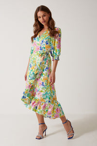 This floral midi dress features a flattering v-neck and self tie waist, team with sandals and denim jacket for a casual day look.