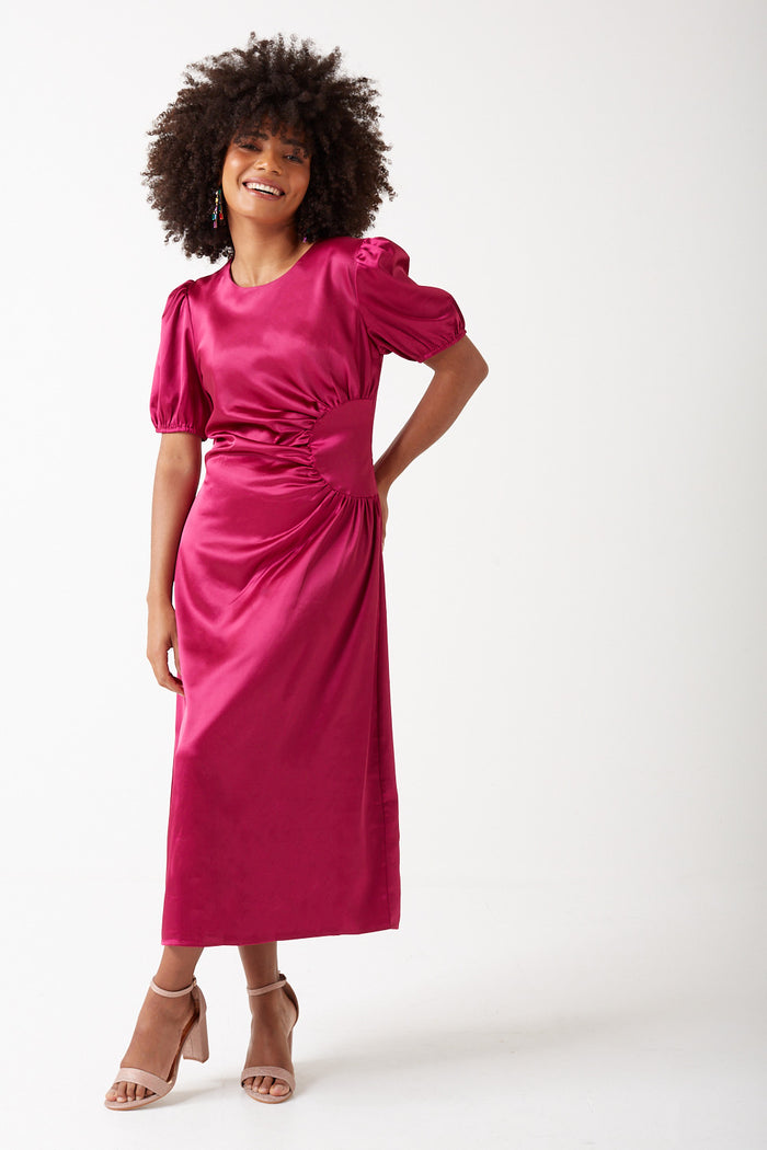 Annalise Puff Sleeve Satin Midi Dress in Pink