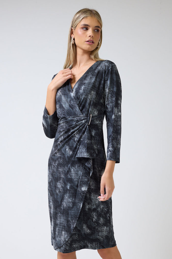 Jane V-Neck Printed Belt Detail Midi Dress in Black