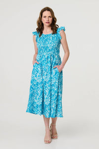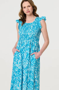 Go for an effortlessly stylish look in this relaxed midi dress. It has a comfortable smocked bodice with a round neck and frilled cap sleeves. The relaxed a-line skirt falls to midi length for a graceful silhouette on all body types.