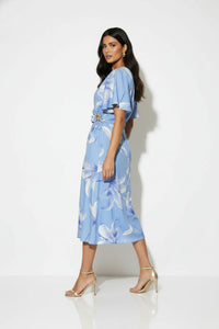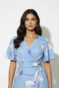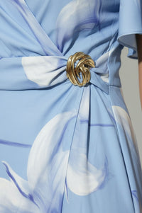 Embrace effortless elegance with the Floral Print Faux-Wrap Midi Dress, perfect for graceful seasonal style. This beautiful midi dress features a cornflower blue base adorned with a large-scale white and violet lily floral print, creating a serene and sophisticated look. Its faux-wrap bodice offers a flattering V-neckline with delicate diagonal draping, cinched at the left waist by a unique sculptural gold-tone brooch, while short flutter sleeves and a subtly overlapping midi skirt complete the graceful silhouette. Crafted from a lightweight woven fabric, this dress provides a comfortable, breathable feel with a graceful drape, ideal for warm weather. Transition seamlessly from daytime events to evening gatherings; pair it with nude heels and a clutch for a polished ensemble. Designed for a true-to-size fit, the elasticized back waist offers comfortable wear.