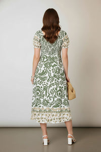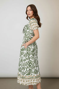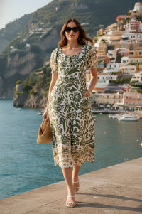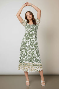 Embrace effortless charm this season with the Stella Floral Print Tie-Front Midi Dress, perfect for sunny days. This woven midi dress features a striking moss green and cream large-scale paisley floral print in a relaxed column silhouette. It boasts a charming square neckline with a playful tie-knot detail at the center front, complemented by short puff sleeves with elastic cuffs and a secondary tan and cream circular border print. Functional side-seam pockets and a straight hem with a wide geometric border in moss green and tan complete the design, with a smocked elastic panel at the center back for added comfort. Crafted from a light, breathable woven fabric, this dress ensures comfort and ease of wear throughout the day. Ideal for warm-weather adventures, this versatile piece pairs perfectly with strappy sandals and a woven bag for a chic daytime look or vacation wear. Designed for a comfortable and flowing fit, we recommend selecting your usual size.