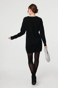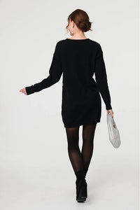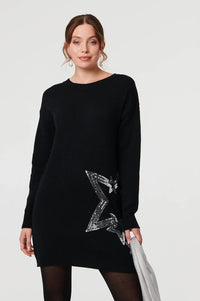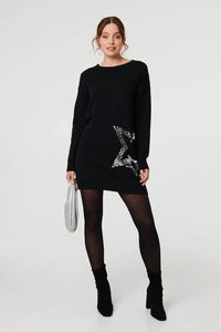 Sequin Star Embellished Short Knit Dress with drop shoulders, long sleeves and a short length hem.