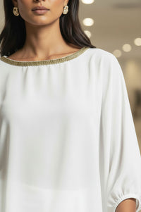 Embrace effortless sophistication with the Gold Trim Batwing Blouse, designed for elevated comfort and chic style. This oversized Gold Trim Batwing Blouse presents a fluid silhouette, draping gracefully with integrated batwing sleeves. It features a wide boat neckline adorned with a shimmering metallic gold braided trim, complemented by elasticated cuffs and a unique bubble-style elasticated hem for a soft, rounded finish. Crafted from a lightweight, sheer georgette-style fabric, this blouse is fully lined for complete opacity and a luxurious, non-see-through feel against your skin. Perfect for both professional settings and elevated casual outings, pair this versatile blouse with tailored trousers or slim-fit skirts for a polished look, or dress it down with sleek jeans. Designed for an intentionally oversized fit, we recommend selecting your usual size for the intended relaxed drape.