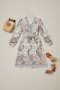 Embrace effortless elegance with our Paisley Print Knee-Length Dress, designed for versatile wear from day to evening. Featuring a beautiful multi-color print, a flattering tie-waist, and convenient side pockets, it's the perfect comfortable yet stylish addition to any wardrobe.