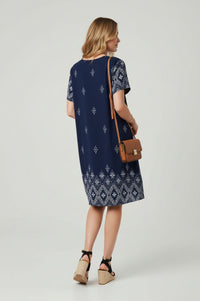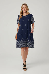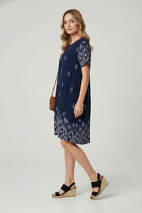 Embrace effortless style and comfort with this versatile Stella Patterned Short Sleeve Shift Dress. Designed in a relaxed shift silhouette, this navy blue dress features a classic round neckline, comfortable short sleeves, and a straight knee-length hem. Its lightweight woven fabric is adorned with striking white geometric patterns along the hem and sleeves, complemented by scattered starburst motifs across the torso. Functional side-entry pockets add practicality to its chic design. Crafted from a soft, breathable woven fabric, this dress offers a comfortable, non-stretch fit perfect for warmer days. Ideal for casual outings or daytime events, pair this versatile piece with your favourite sandals or espadrille wedges for a complete look. It’s perfect for brunch, vacation, or relaxed weekend wear. This Stella dress offers a relaxed fit; consider your usual size for comfortable wear.
