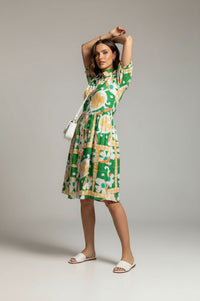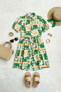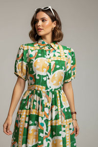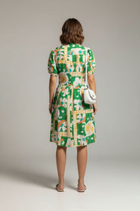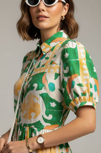 Embrace effortless style and vibrant energy with the MARC ANGELO Short-Sleeved Abstract Print Shirt Dress. This charming shirt dress features a relaxed silhouette, defined by a sharp pointed collar and a full-length center button closure. Short puffed sleeves add a touch of playful volume, while the gathered flared skirt creates graceful movement. Its standout all-over abstract geometric print in kelly green, tangerine orange, sunshine yellow, and white ensures you'll make a statement. Crafted from a slubbed woven fabric, this dress offers a light and breathable feel, perfect for warm weather comfort with a subtly textured finish. Ideal for resort getaways, daytime events, or casual outings, pair it with simple sandals for a relaxed look or wedges for an elevated ensemble. Designed for a comfortable, true-to-size fit, offering ease without sacrificing style.