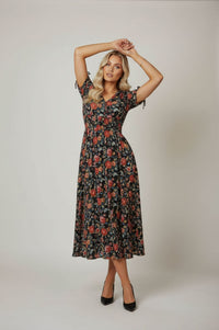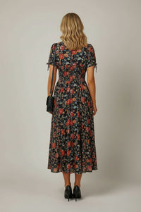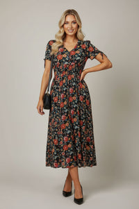Embrace effortless elegance with the Stella Smocked Floral Midi Dress, a charming choice for versatile styling. This midi-length A-line dress features a flattering V-neckline adorned with five small fabric-covered buttons leading to a wide, elasticated smocked waistband. Short puff sleeves include functional self-tie bow details at the outer hem, complementing the flowing skirt in soft pleats. Crafted from a lightweight woven fabric in midnight black, it boasts a dense floral print in rich terracotta, cornflower blue, and mustard yellow, offering comfortable wear. Perfect for garden parties or sophisticated brunches, pair this Smocked Floral Midi Dress with your favorite heels or dressy flats for a polished ensemble. The smocked waist provides a comfortable, true-to-size fit that accentuates your silhouette.