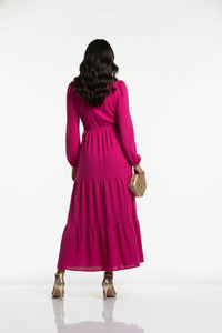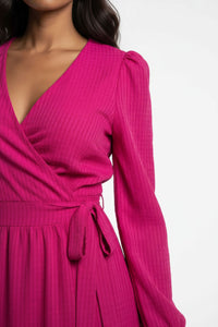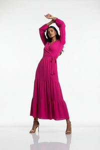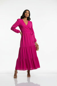 Embrace radiant style and effortless elegance with the MARC ANGELO Textured Tiered Wrap Maxi Dress. This vibrant fuchsia maxi dress features a flattering wrap-style bodice creating a deep V-neckline, secured by a self-fabric tie. Long sleeves with delicate puff shoulders and elasticated cuffs complement the flowing, tiered skirt construction, offering a graceful silhouette. Crafted from a unique textured seersucker-like fabric with a subtle grid pattern, this dress offers a lightweight and breathable feel, perfect for comfortable wear. Perfect for daytime events or evening gatherings, you'll love pairing this MARC ANGELO dress with delicate heels for a sophisticated look, or sandals for a relaxed feel. Designed for a flattering and comfortable fit, this dress generally runs true to size.