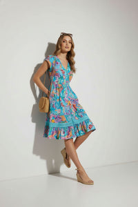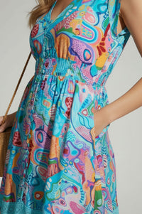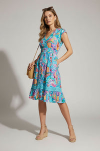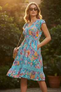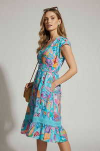 Embrace vibrant style with the Stella V-Neck Button-Front Printed Dress, perfect for sunny days and effortless elegance. This A-line dress features a playful multi-colored abstract graphic print on a bright sky blue background, complemented by a deep V-neckline and charming short cap sleeves. A functional center-front button placket and an elasticized, smocked waistband create a flattering silhouette. Two practical side-seam pockets and a wide tonal crochet lace trim above the tiered ruffled hem add delightful details. Crafted from lightweight woven fabric, this dress offers a breezy, comfortable feel, ideal for warm weather wear. Pair this V-Neck Button-Front Printed Dress with espadrille wedges for a garden party or flat sandals for a relaxed weekend outing. Its vibrant design makes it a versatile choice for casual events. Designed with an elasticized waist, this dress offers a comfortable, flexible fit that generally runs true to size.