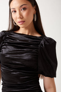 Update your dress collection with this faux velvet ruched short dress. Wear with heels and blazer to complete the look.