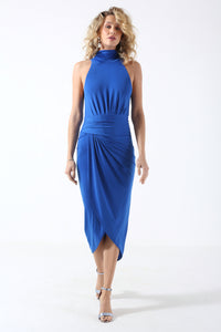 Chiara V-Neck with Tie Bodycon Assymetric Midi Dress in Blue