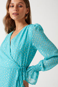 This gorgeous midi dress features a foil spot print, faux wrap front and long shirred sleeves, style will heels for an occasion worthy look.