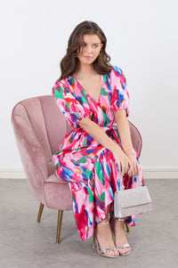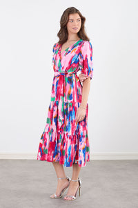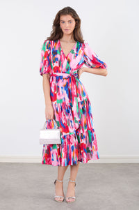 The dress features a v-neckline and a wrap style, tied at the waist with a ribbon. The fabric has a multi-colored abstract print, with shades of pink, red, green, blue, and various other colors, creating a dynamic and eye-catching pattern. The dress has a tiered skirt with ruffles at the bottom.