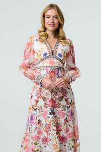 This beautiful kimono dress has a deep v-neck with a button fastener for modesty. It has long semi sheer puff sleeves, an empire waist and a flared a-line skirt. This maxi dress is a must-have for special occasions such as weddings and other formal plans. It's made from a cotton blend materials for extra comfort, too.