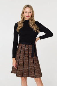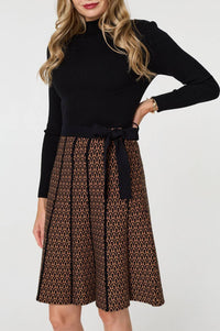 This elegant dress has a skater shape and a tie waist that will flatter every figure. The knitted material has a pleated finish for a classic, feminine look. It also has a high neck, long sleeves and a knee length hem. Style with boots or heels for an evening outfit.52%Rayon30%Polyester18%Nylon.