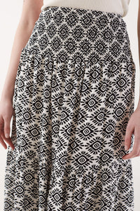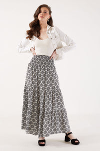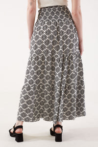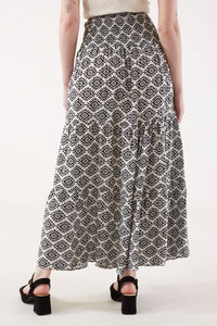 Amelia Geometric Printed High Waist Tiered Maxi Skirt in Black and White