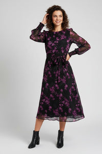 Turn heads in this elegant Black & Red Floral Midi Dress, a statement piece perfect for both day-to-night styling. Crafted in a flowing lightweight fabric, this dress features a flattering fit-and-flare silhouette with a self-tie waist belt for a defined shape. The bold red floral print pops against the deep black base, while the sheer long sleeves add a touch of sophistication and ease. Finished with a round neckline and midi length, this dress is timeless yet striking.