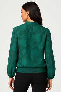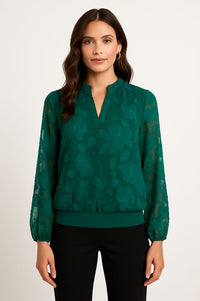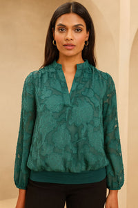 Add a touch of elegance to your everyday style with this green textured blouse. Designed with an all-over floral jacquard effect, it brings subtle dimension and sophistication to your look. The blouse features a flattering V-neckline with a soft stand collar, long sheer sleeves with elasticated cuffs, and a gathered hemline for a comfortable yet polished fit. Perfect for pairing with tailored trousers or jeans, this blouse transitions seamlessly from desk to dinner.