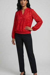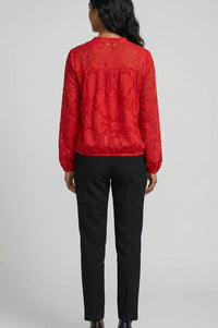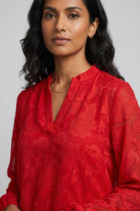 Add a touch of elegance to your everyday style with this red textured lace blouse. Designed with an all-over floral jacquard effect, it brings subtle dimension and sophistication to your look. The blouse features a flattering V-neckline with a soft stand collar, long sheer sleeves with elasticated cuffs, and a gathered hemline for a comfortable yet polished fit. Perfect for pairing with tailored trousers or jeans, this blouse transitions seamlessly from desk to dinner.