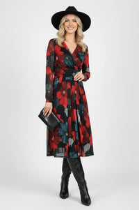 V-neck wrap midi dress with long sleeves. The garment features an all-over floral pattern in red, teal, and white on a black background. It includes a self-tie fabric belt at the waist and is constructed from a lightweight, semi-sheer material.