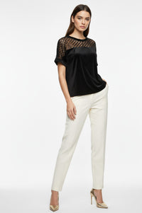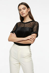 A sleek black top with a glossy satin body and a sheer lattice mesh yoke for a modern, dressed-up finish. The relaxed silhouette drapes easily, while cuffed short sleeves keep it polished from day to dinner.