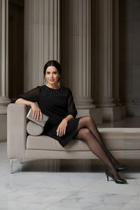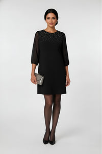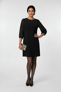 Step into effortless elegance with this classic black shift dress. The relaxed silhouette offers comfort without compromising style, while the sheer three-quarter sleeves add a touch of sophistication. The neckline is beautifully adorned with delicate embellishments, creating subtle sparkle that catches the light. Finished with a chic above-the-knee hemline, this dress pairs perfectly with heels and a clutch for cocktail parties, formal dinners, or festive celebrations.
