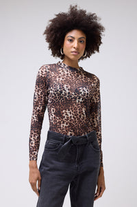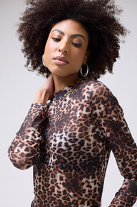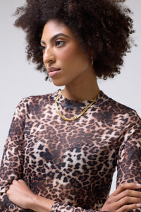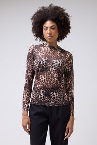 Jass Leopard Print Sheer Mesh Long Sleeve Top in Beige