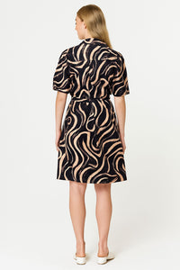 Effortlessly chic and versatile, this black and blush shirt dress features a striking hand-painted style abstract print for a modern, artistic edge. The button-through front, classic shirt collar, and short puff sleeves give a smart yet relaxed silhouette, while the self-tie belt cinches the waist for a flattering fit. Cut to a knee-length, this dress transitions seamlessly from day to evening — pair with trainers for a casual look or elevate with heels for a polished finish.