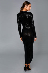 Be noticed this festive season in this all over black sequin midi dress. Featuring a plunging neckline and thigh-high split, style with a clutch bag and strappy heels.