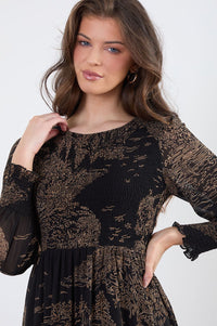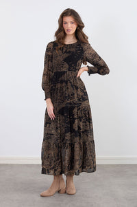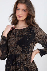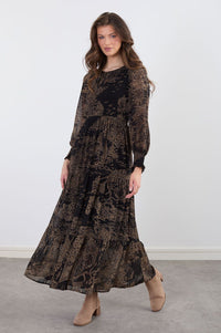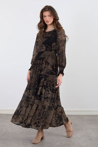 The dress has a round neckline and long sleeves with slight gathered detail around the cuffs. The pattern on the dress is a subtle, somewhat abstract design, resembling stylized landscapes or scenery, in shades of light beige/tan against a black background. The pattern is layered, with tiered frills of the same patterned fabric along the hemline of the dress.