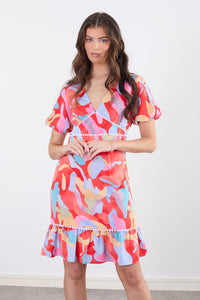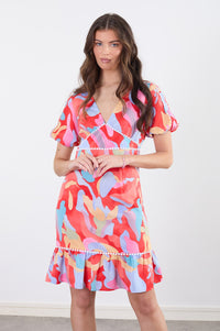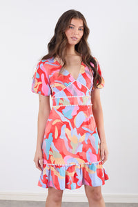 The dress features a v-neckline and short puff sleeves. The pattern is a mix of various colors, including muted pinks, light blues, greens, and yellows, all laid out in a layered, abstract camouflage or tie-dye style over a rich, coral red. White or off-white small pearls or beads are sewn in a decorative band across the bodice and on the hemline of the dress.